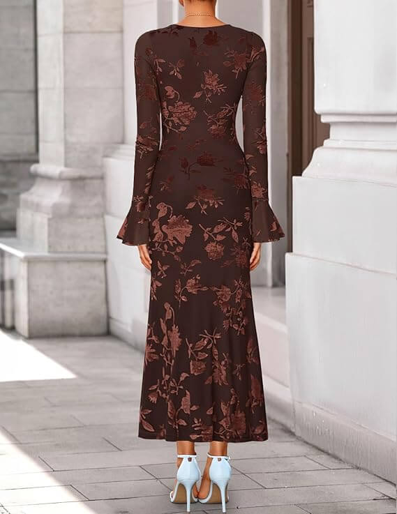 • Design: This maxi party dress features an exquisite flocked floral print and bell sleeve design, catching the eye at first glance, making it look chic and playful. The bodycon style highlights sexy and elegant body curves, exuding femininity, elegance, and charm