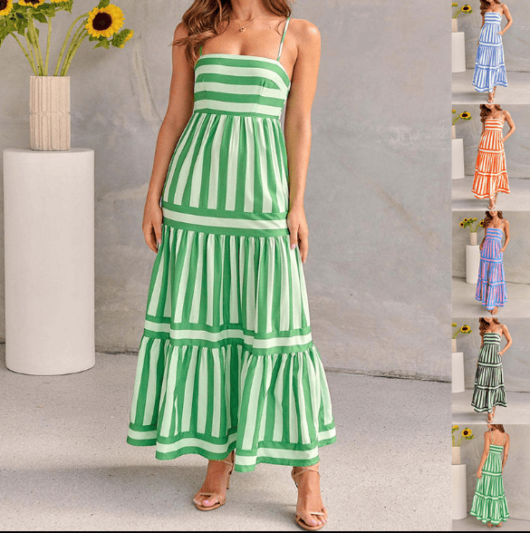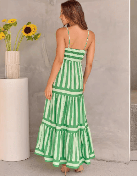 Green and white striped dress worn by a person, with a neutral background