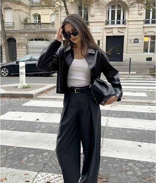 • Design: This cropped leather jacket elevates your frame with its polished silhouette, achieved through a chic lapel collar, long sleeves, and classic button closures. Cropped length hits right at the waist, creating a flattering proportion that highlights high-waisted bottoms and elongates your torso, all while offering the convenience of functional side pockets