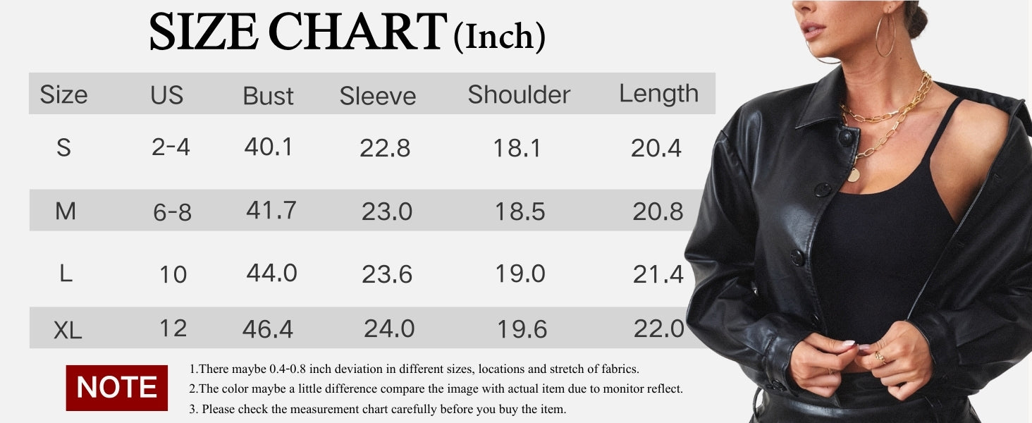• Sizing Guide: S=US 2-4, M=US 6-8, L=US 10, XL=US 12. Our black cropped leather jacket have a slim fit. If you prefer an oversized fit, we recommend buying one size up! Experience the perfect blend of luxury and comfort in this women's black leather jacket. Meticulously crafted from ultra-soft faux leather and finished with a soft lining. Ideal for layering in spring, fall, and winter,The faux leather jacket blends edgy style with cozy comfort