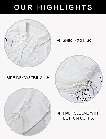 Design Elements Features a shirt collar, half sleeves with button cuffs, and an adjustable side drawstring.